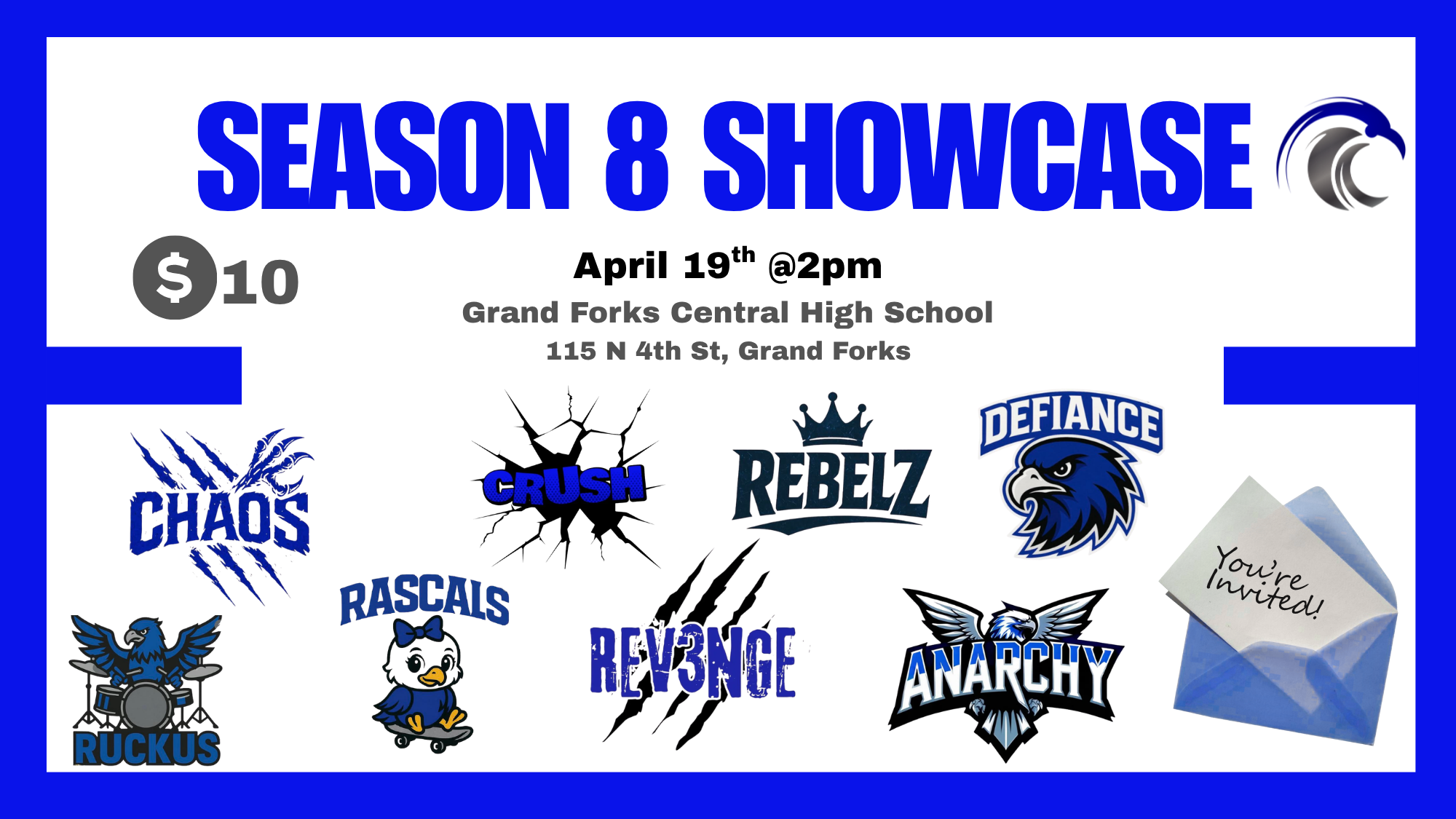 Join us THIS Sunday April 19th for our end of season showcase. 8 teams, our spring performance team, and solos will be showcased. Location: Grand Forks Central High School Main Gym Time: Doors open at 1pm, show starts at 2pm! Cost: $10 cash or card at the door